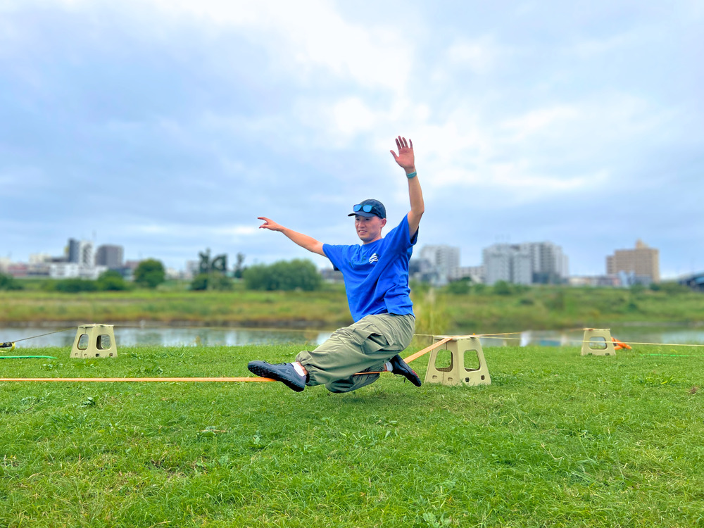 揺れるベルトの上でバランスに挑戦!スラックラインをオリンピック種目にしたい、と“たくらんで”いるそう。