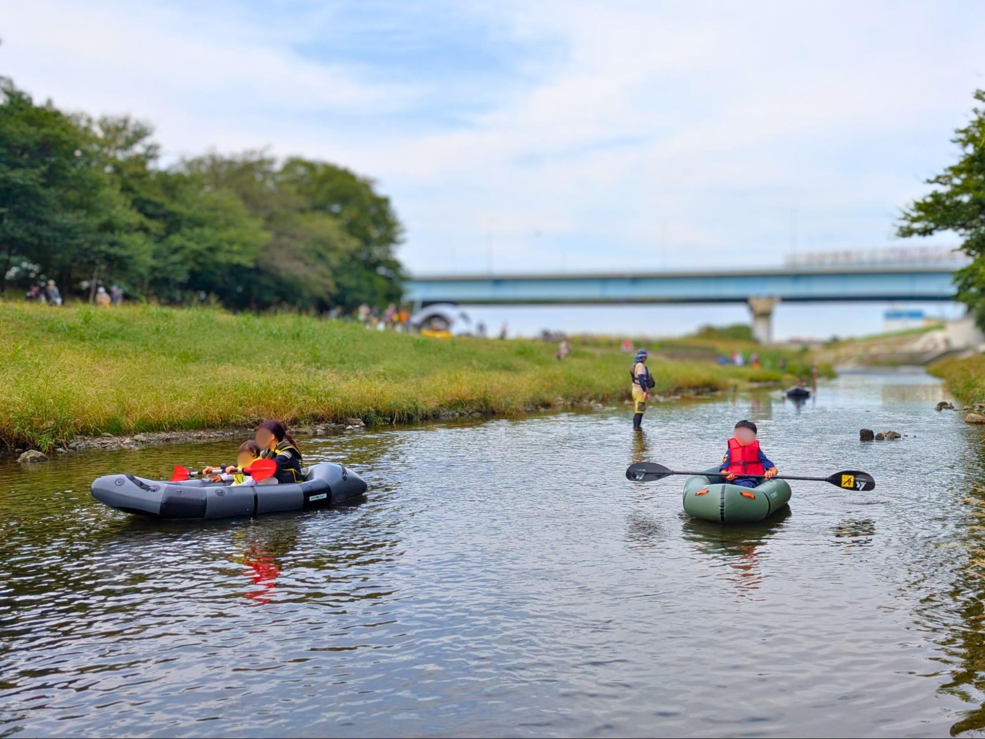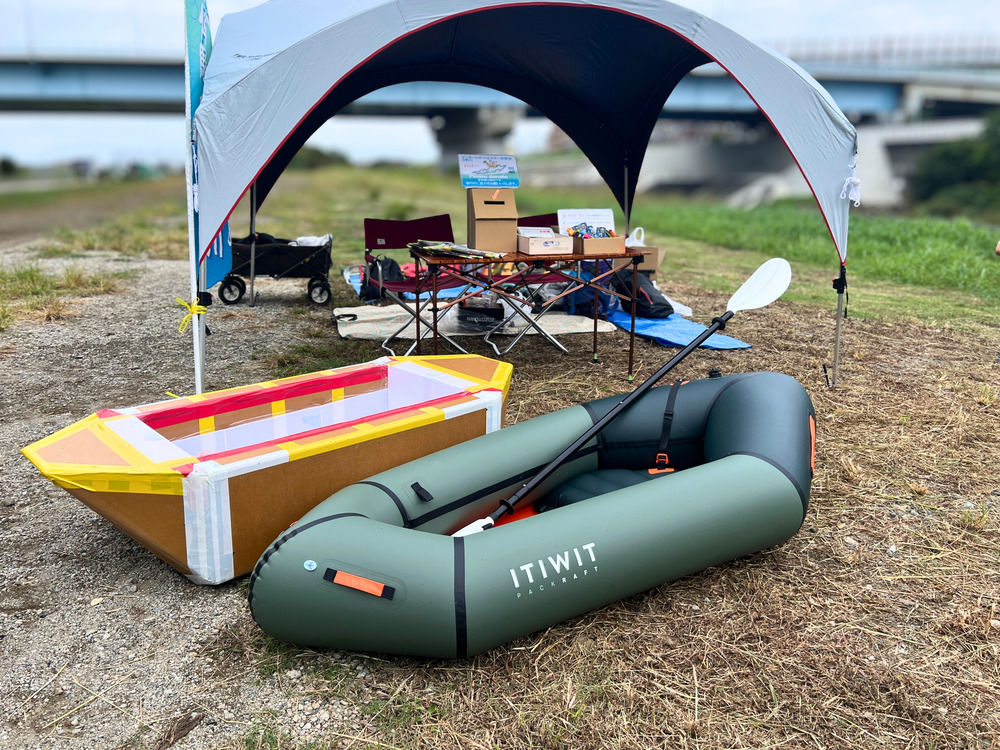 多摩川の支流・野川で、ダンボールボードやカヌーにのって川遊びを満喫できるアクティビティ。