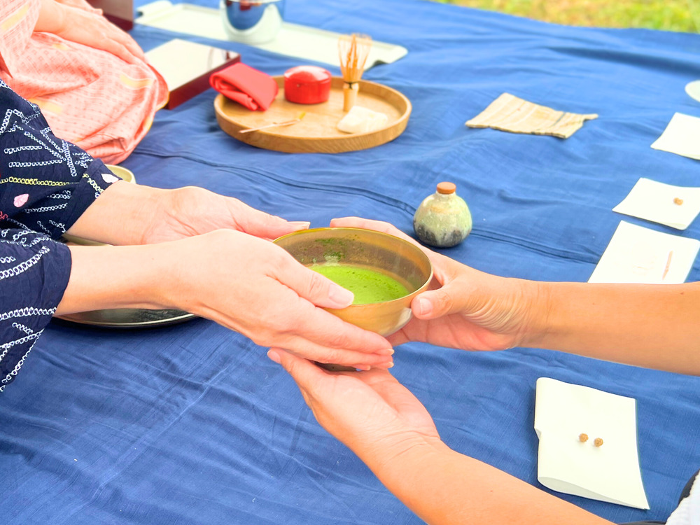 目の前の多摩川を眺めながら、茶菓子と抹茶をゆったり堪能。茶席の方や先生と茶器や道具について語らう時間も、贅沢そのもの。