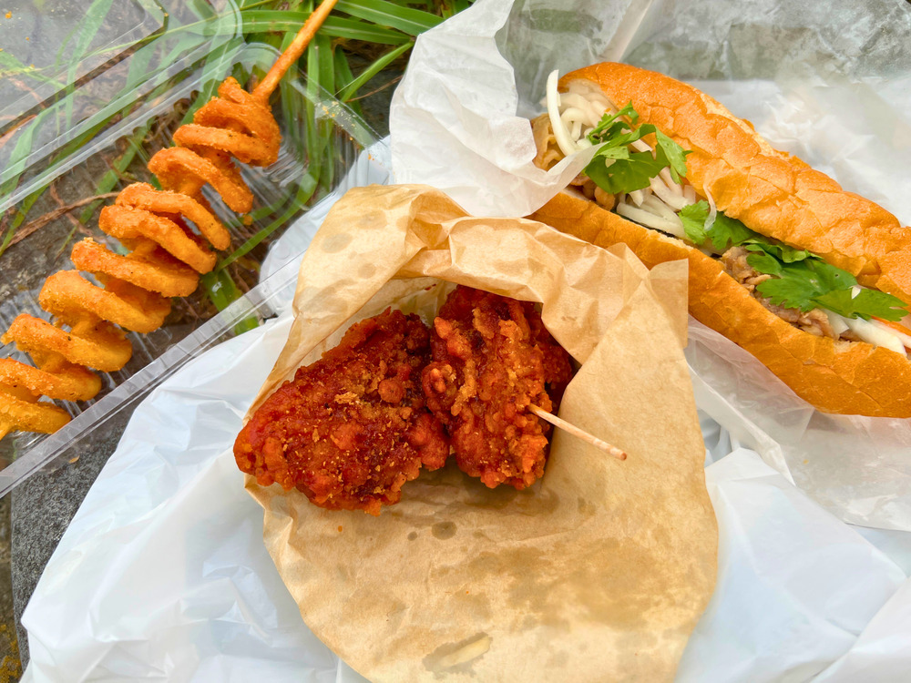 五香粉香る台湾唐揚げや特製タレの豚肉バインミー。子どもに人気のハリケーンポテトやチーズハットク、駄菓子コーナーも♪