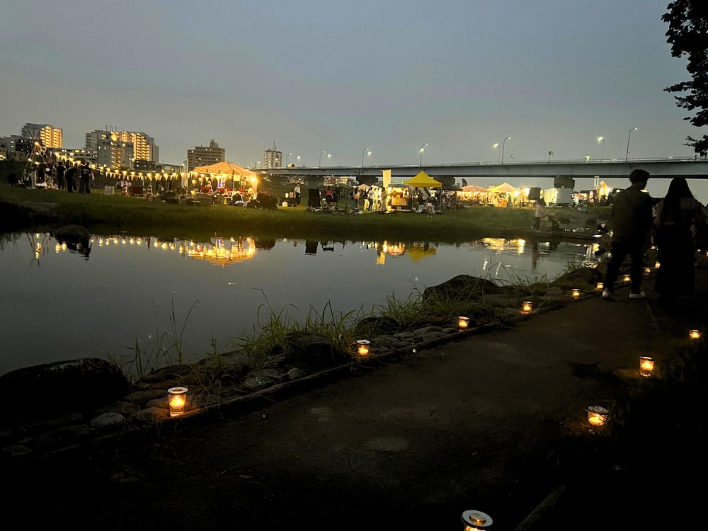 レジャーシートで食事を楽しんだり、芝生に座って音楽を感じたり、夕日に染まる多摩川を眺めたり。