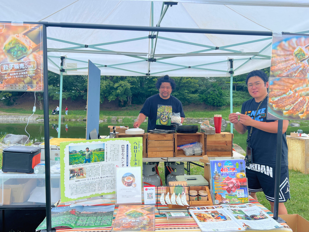 キャベツたっぷりの手作り餃子はタレなしでも絶品。社長の坂尾さんはDJとしても登場!