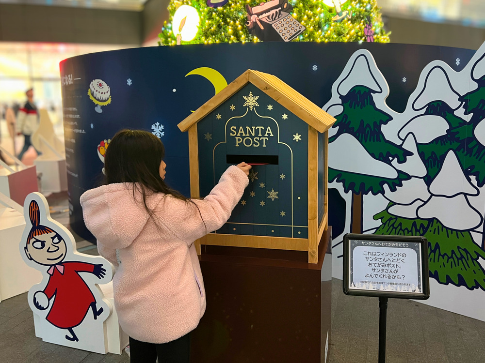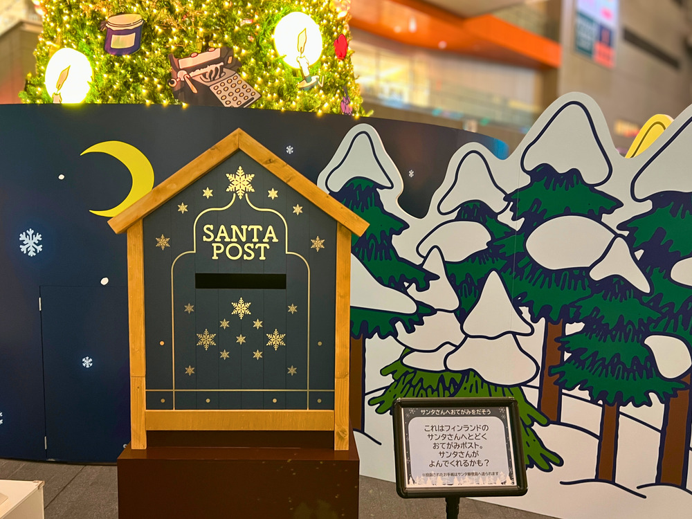 サンタポストは、ツリーの裏手、雪玉を持ったリトルミイの近くにありますよ。