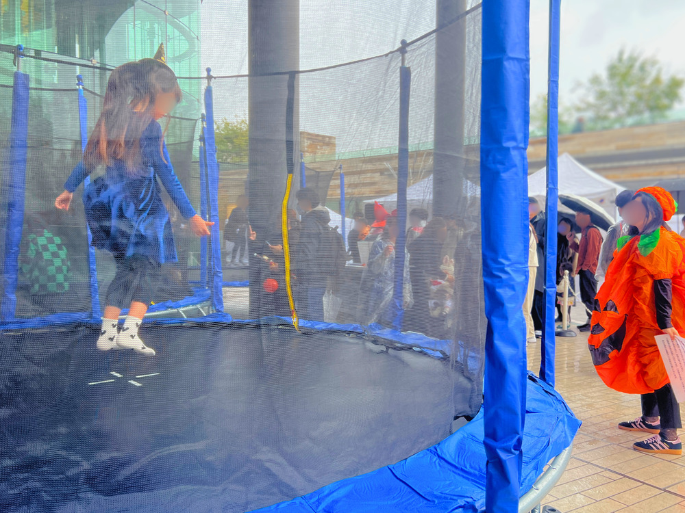 【ハロウィンキャッスル】【ようかいランド】は雨で中止となってしまいましたが、子どもたちは【トランポリン】に大集結!