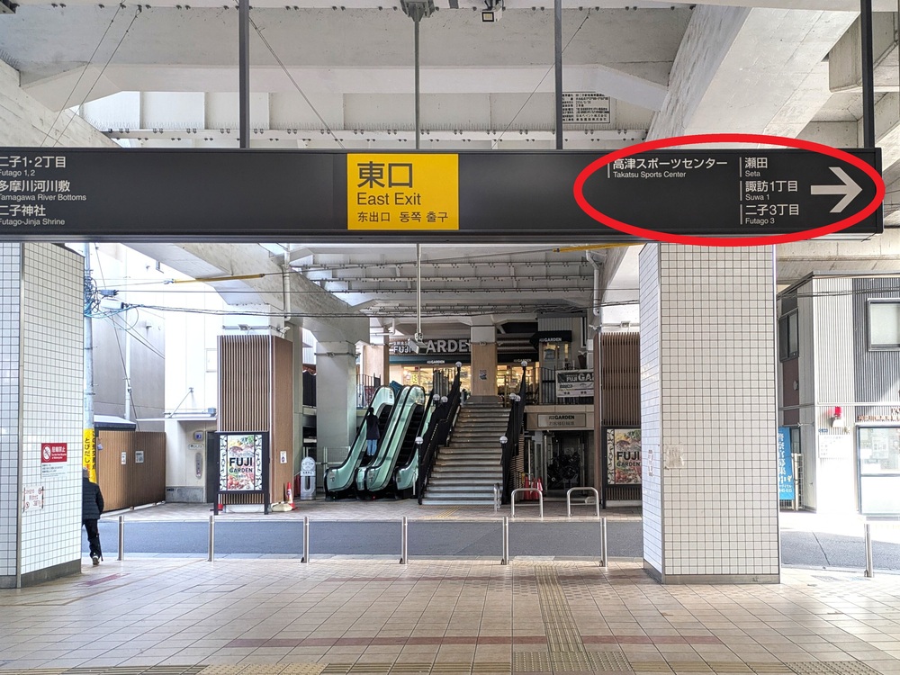 改札を出ると上部に案内板があり、高津スポーツセンター方面が矢印で示されているのでそれに従います。