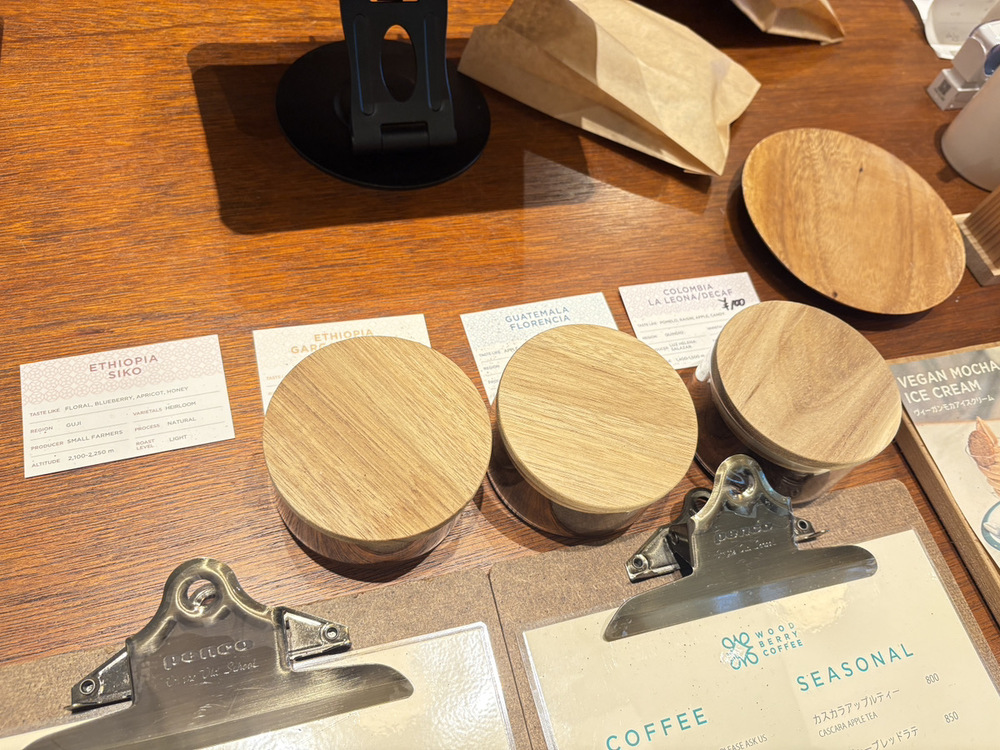 レジで注文をしようとしたら、店員さんのおすすめ3種類の香りを確認できました。その豆の特徴などを丁寧に説明してくれるので、自分好みのコーヒーを選べます。