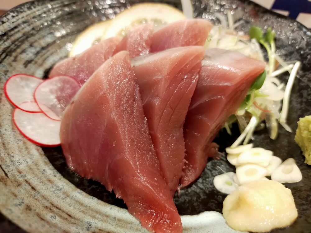 運ばれてきたかつおの刺身は、厚めに切られた身が美しく盛り付けられ、思わずしばらく皿を回して眺めてしまいました。