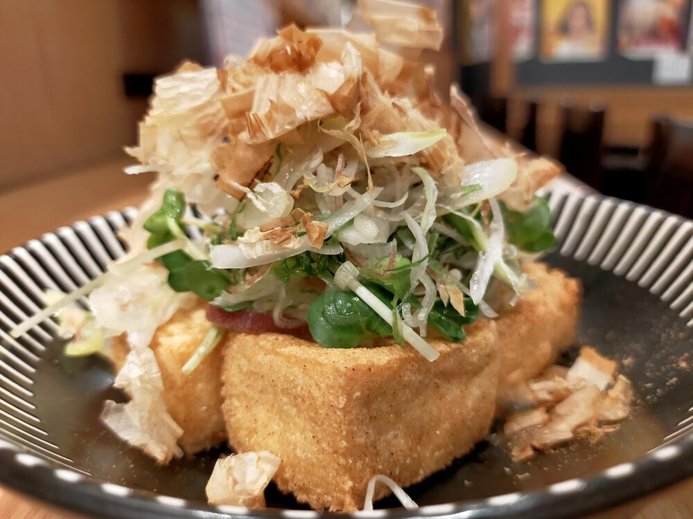 「薬味たっぷり自家製厚揚げ」は、ひと口大で食べやすい厚揚げにモリモリの薬味がのせられ、香り豊かでさっぱり楽しめます。