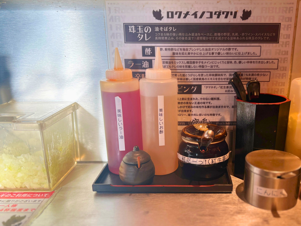 卓上には、油そばにまぜて楽しむ調味料たちがずらり!