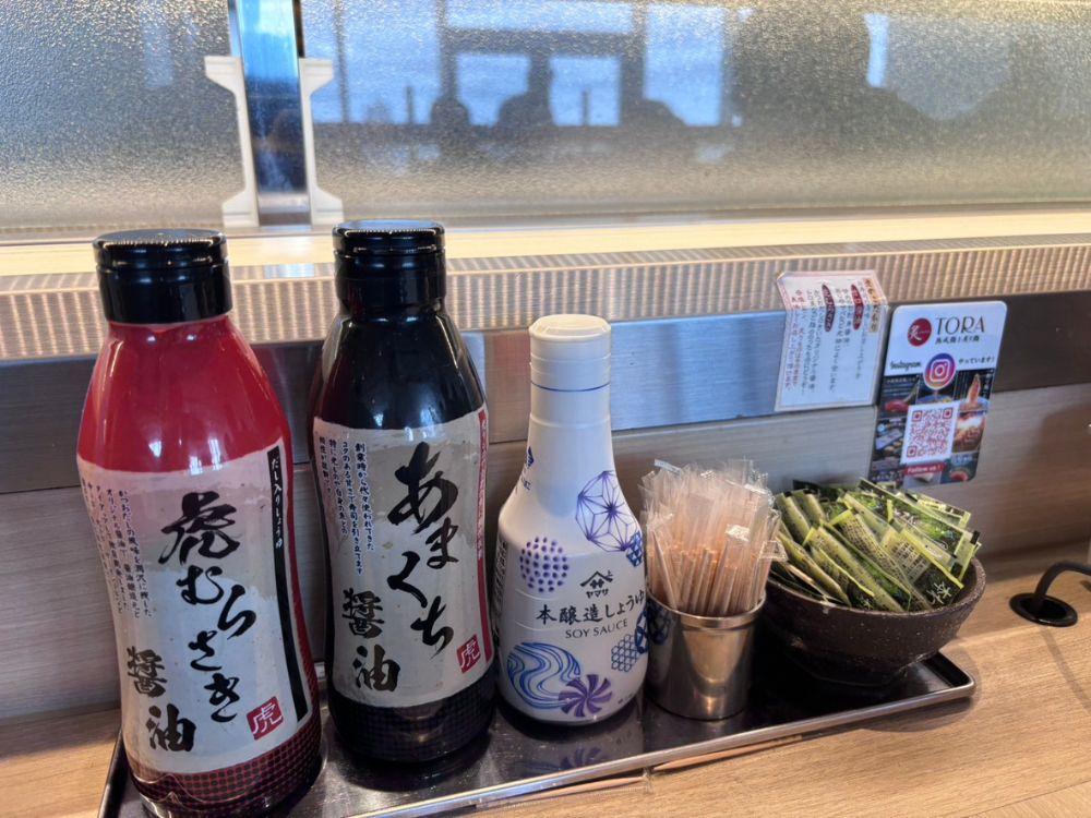 あまくち醤油は甘めのお刺身醤油であじやサバなど光物によく合うこと、虎むらさき醤油はかつおだしのきいたオリジナル醤油とのことでトロ系など脂ののったものにあうことなど、どの醤油が何に合うかわかるようにメモ書きもありました。