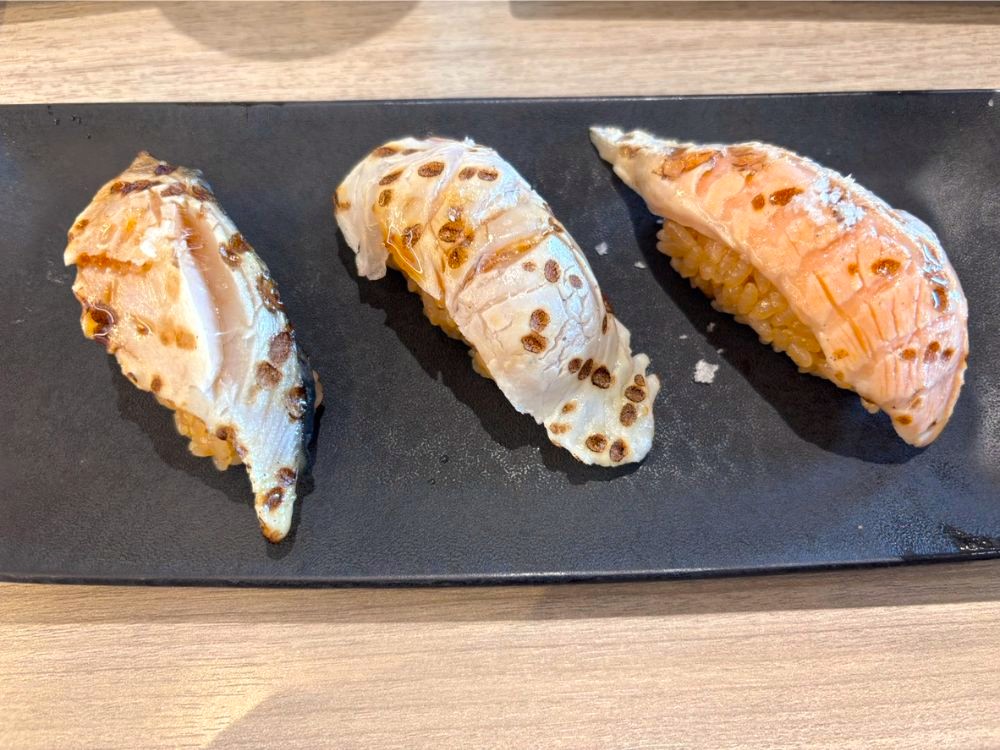 味は炙ってあるので香ばしいのですが、海老やサーモンはクリーミーで新感覚のお寿司です。