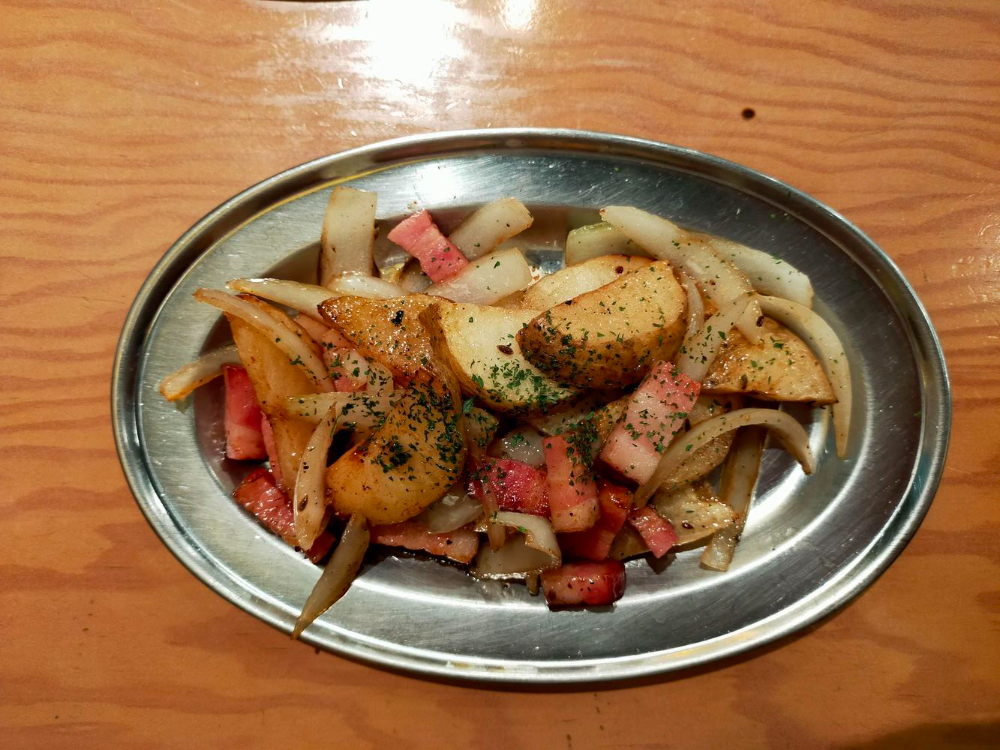 ジャーマンポテトは、くし切りのポテトのほくほくと歯ごたえのいい玉ねぎの食感が良くて、大好きなベーコンと一緒に次から次へと口に運ばれていきます。