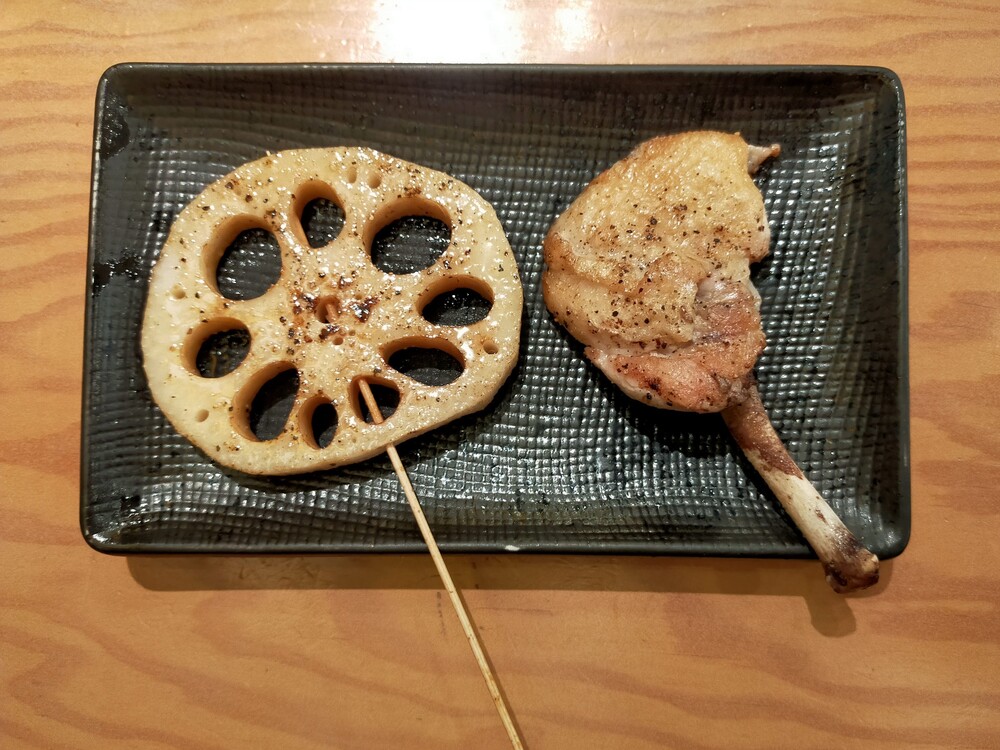 もうお腹いっぱいだね……と言う連れの言葉を聞きながら、どうしても外せなかったれんこん醤油バター(写真左)とチューリップ(手羽先/写真右)を注文。