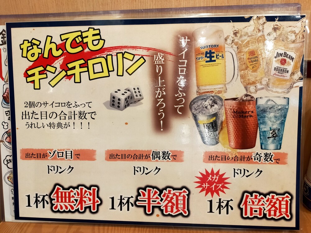着席して、まずは飲み物を頼もうとメニューを見ると、「なんでもチンチロリン」という文字。