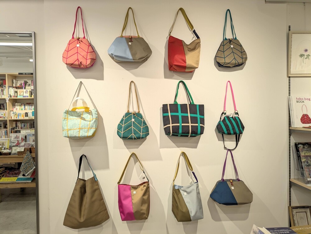 タイルやブックカバー、トートバッグ、ポーチ、カットクロスなどが展示販売されていました。