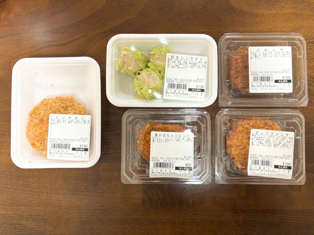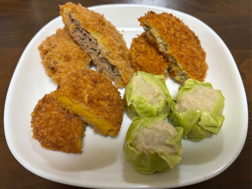 左上からメンチカツ、その右がぎょうざメンチ、左下が栗かぼちゃコロッケ、右下が枝豆しゅうまいです。