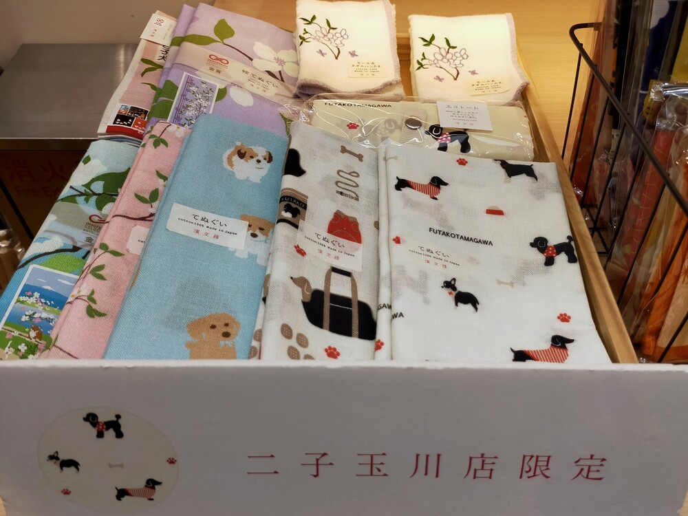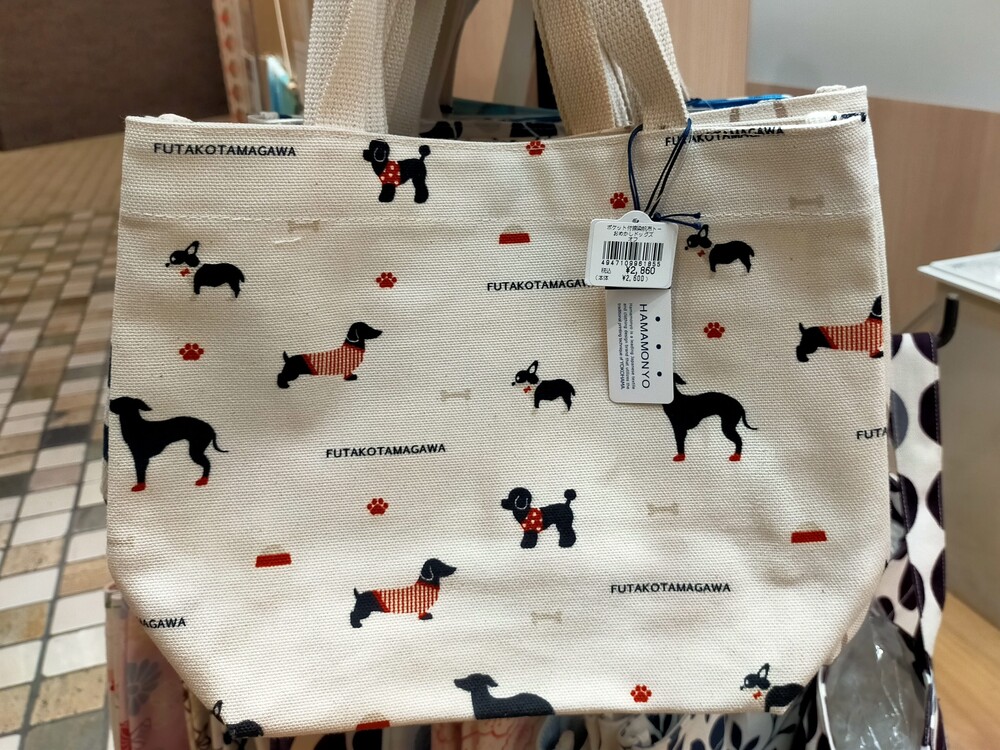 FUTAKOTAMAGAWAの文字とワンちゃんが組み合わさった柄は、散歩の多い街ならではの親しみやすさがあります。