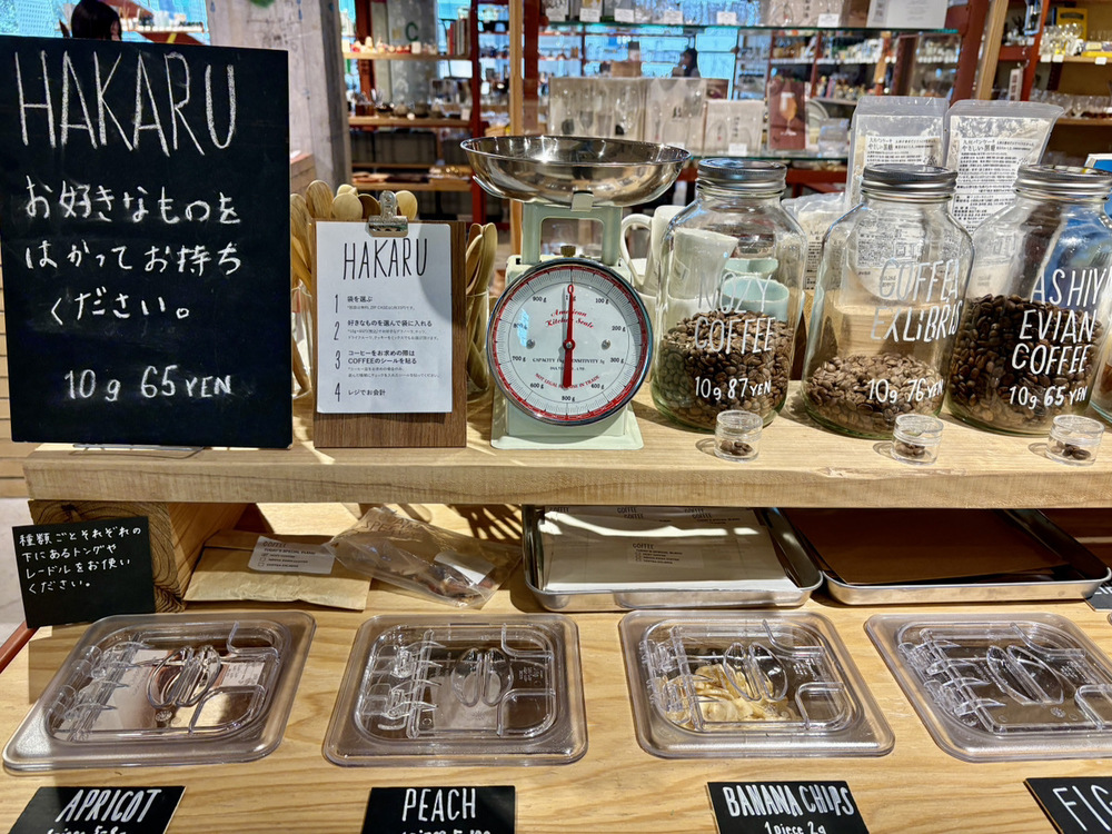 写真の「HAKARU」に手順もわかりやすく書かれているので、それを見ながら好きな分量を量ってレジまで持っていきました。