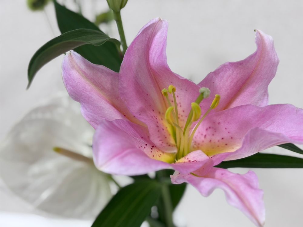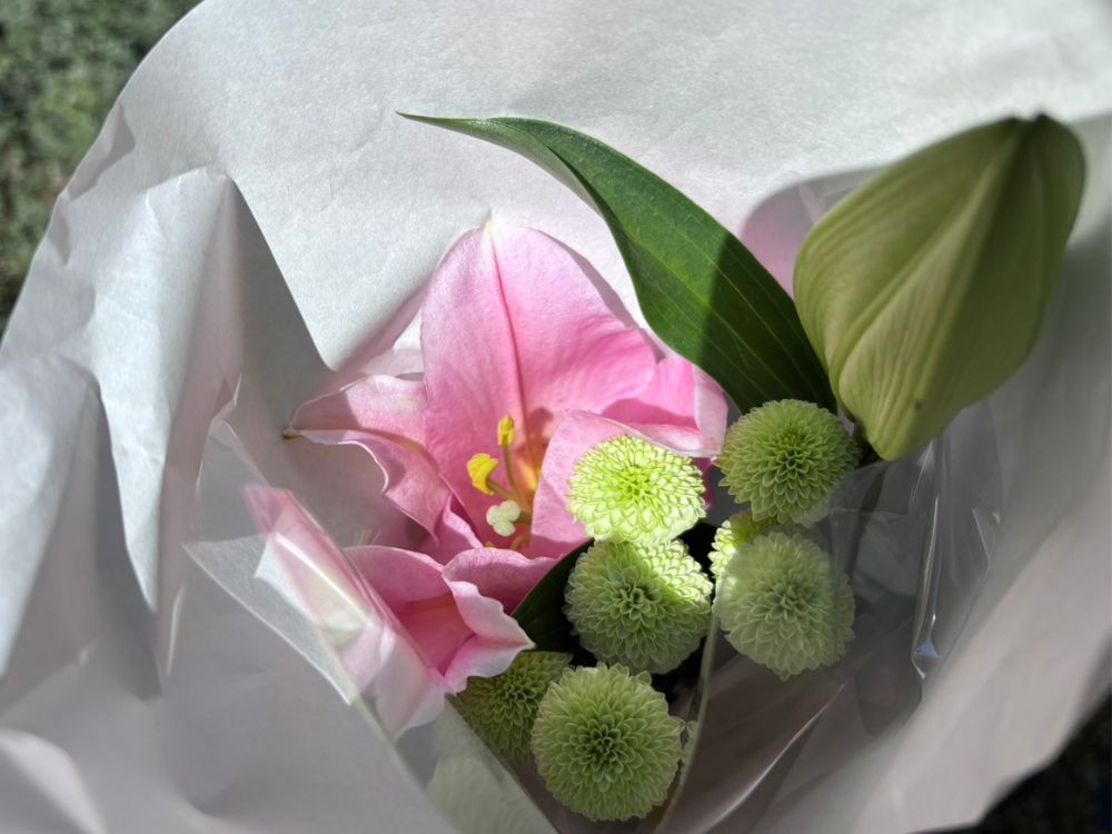 我が子が店内でさまざまな花をみて「ピンクの花がいい」と言ったので、ピンクのユリが入ってるこちらにしました。