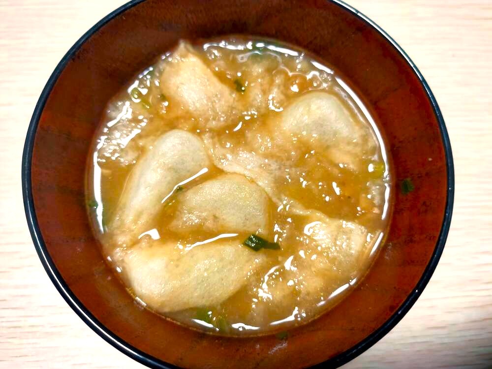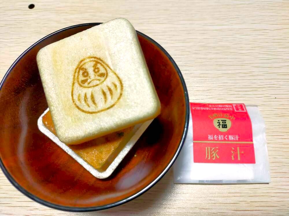 まずは「美噌汁最中(豚汁)」。袋を開けた瞬間、最中の香ばしい香りがふわりと広がりました。お湯を注ぐと最中がしんなりやわらかくなり、香りが一段と豊かに。