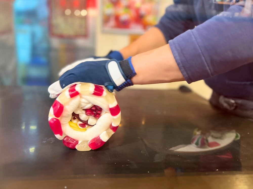 一番外側にカラフルな柄の飴を巻いて完成、キャンディーの“太巻き”みたいですね。