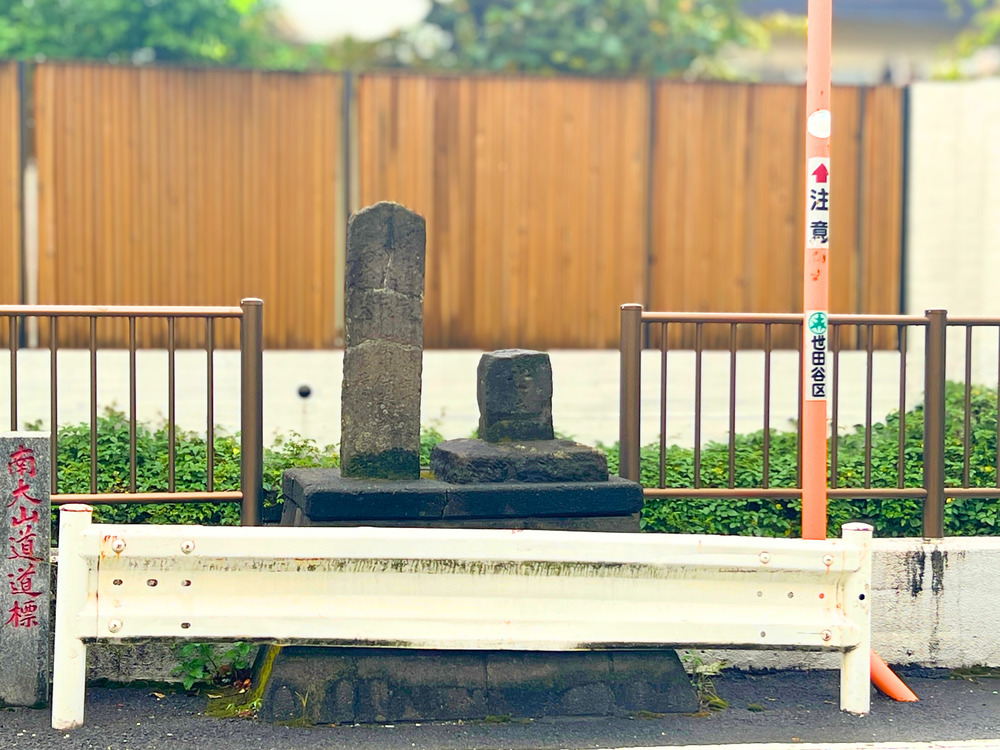 突き当たって右へ曲がると、川沿いは昔からこの場所に静かに佇む「南大山道道標(みなみおおやまみち どうひょう)」が。