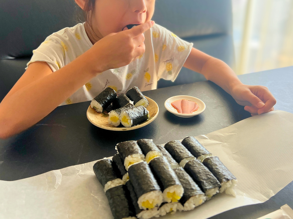 学校からお腹を空かせて帰ってきた娘、かっぱ巻きとたくわん巻きを見て大喜び!